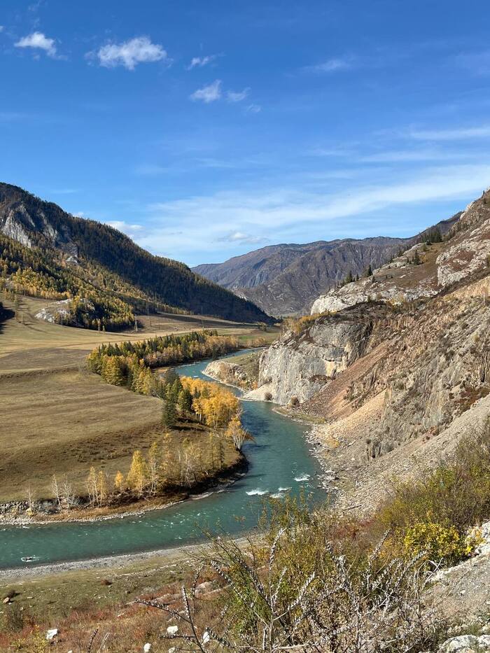 А вот другая река нас поразила до глубины души! Когда за окном появилась Чуя - мы не поверили своим глазам! Нет, мы конечно видели ее зимой, когда она совсем прозрачная, но первый раз видели, что Чуя бирюзовее и прозрачнее, чем Катунь. Ехали - и не могли налюбоваться этой бирюзово-голубой рекой в обрамлении золотых деревьев