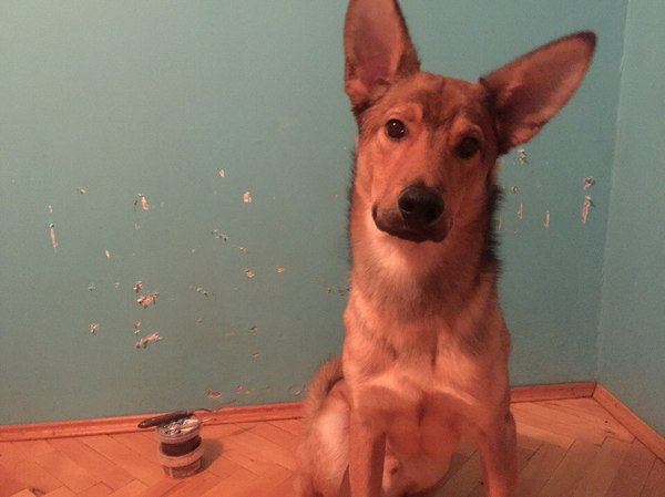 Годовалый кобель, худой, большие уши, рыжий, в синей шлейке с телефонным номером. Откликается на имя Оли или Оливер.