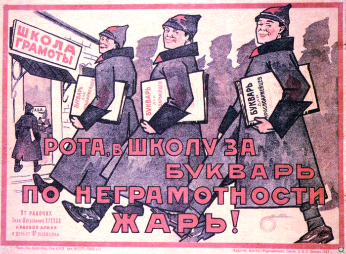 Пресловутый «ликбез» с самого начала был устроен как агитационная кампания за «власть Советов». Губернские совдепы устанавливали «сроки ликвидации безграмотности», так же как и сроки проведения продразвёрстки. В случае неисполнения чиновники отвечали перед Совнаркомом — если не головой, то местом. Букварь с примитивными текстами о преимуществе советской власти над другими политическими режимами был одним из главных инструментов новой пропаганды.