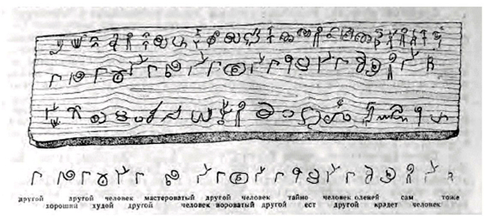 «Тогда Тыневиль послал записку младшему сыну, учившемуся в школе на Усть-Белой. Мальчик прочёл, сказал учительнице, та — продавцу кооператива, и капканы тотчас прислали. Вслед за тем письмена его вышли за пределы семьи». Сергеев М. А. Изобретатели письменности // На Севере дальнем. 1956. № 4