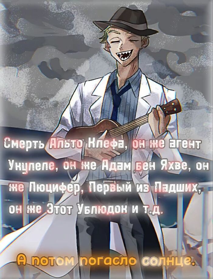 Последняя фраза отсылает нас к рассказу, состоящий лишь из одного «А потом погасло Солнце», зато название у него длинное: «Смерть Альто Клефа, он же агент Укулеле, он же Адам бен Яхве, он же Люцифер, Первый из Падших, он же Этот Ублюдок и т. д.». У англ. комьюнити оно набрало большой рейтинг и стало популярным. Так завершилась история Клефа в одном из миров фонда SCP. Этот цикл там продолжается, судя по всему вечно. Жутковато немного. Таким образом, под словами «Клеф убил вселенную SCP» имеется в виду убийство почти всех самых главных и руководящих сотрудников фонда SCP.