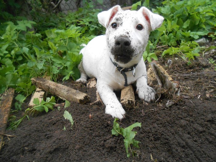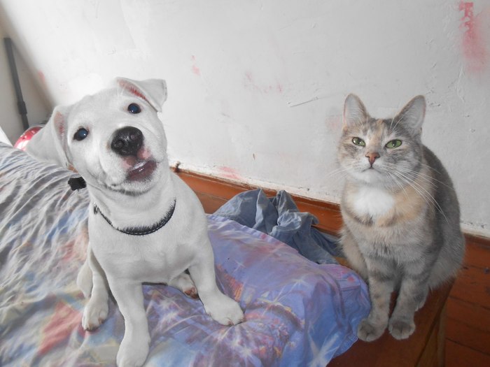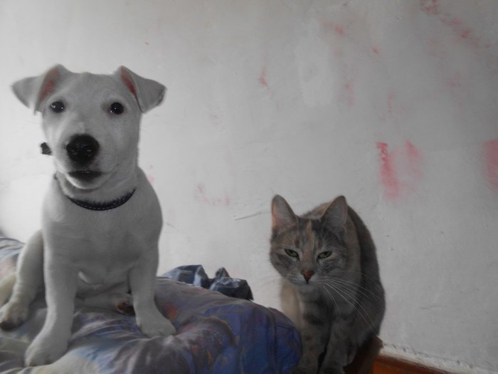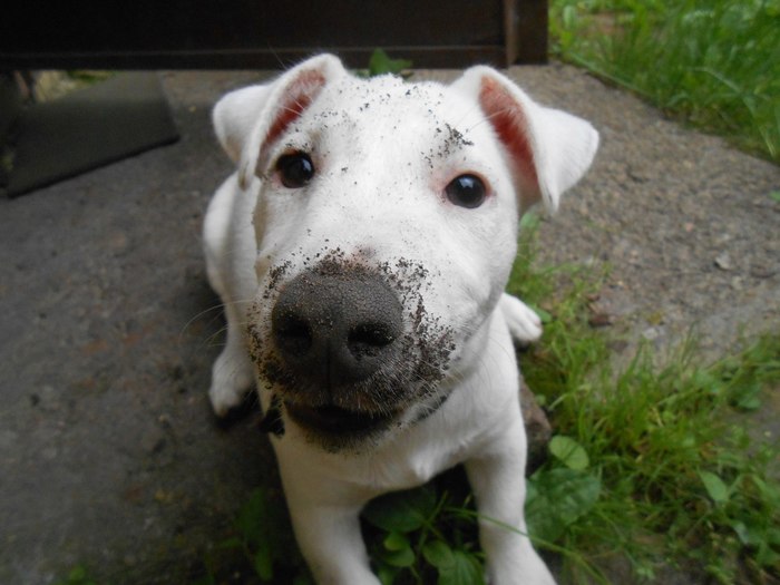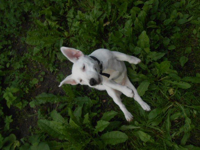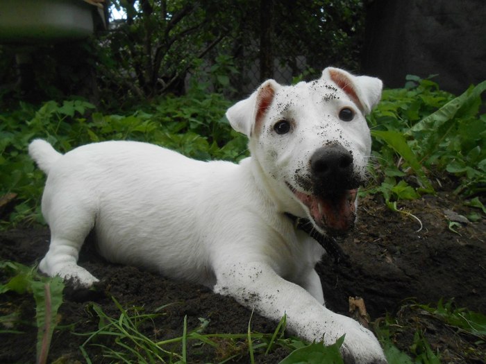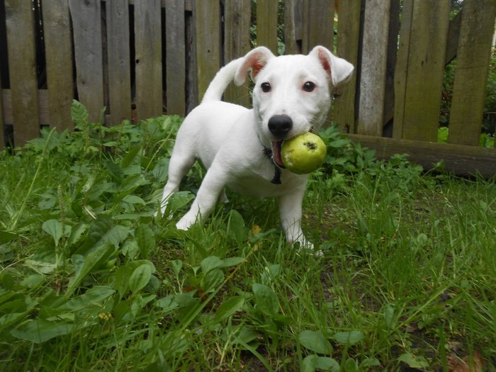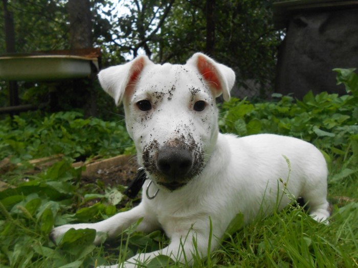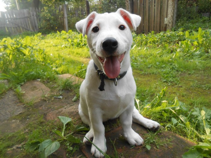 Зовут Норма Оккервиль. По простому Псаки Нормасина! Альбинос Джек-Рассел! ПыСы..котяка, так и зовут - Котякаю