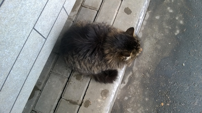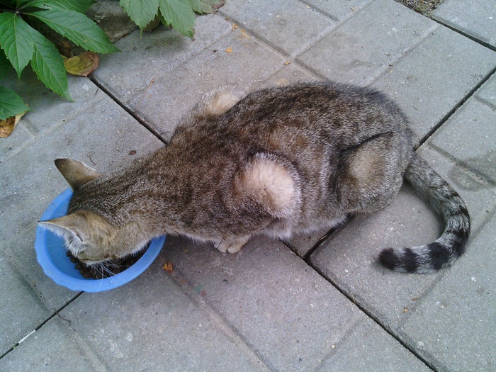 Кот непонятного окраса: вроде исходный серо-коричневый с чёрным рисунком табби, но на затылке и спине очень широкая чёрная полоса. Вероятно, это тоже абундизм: