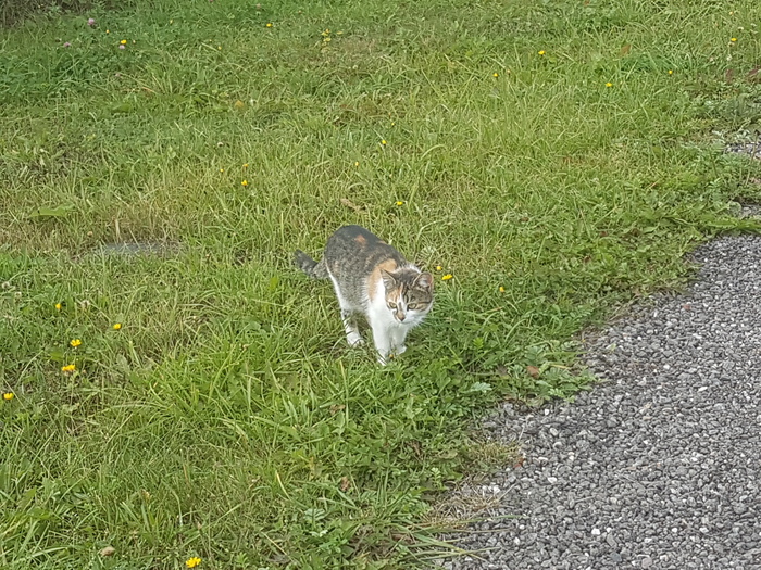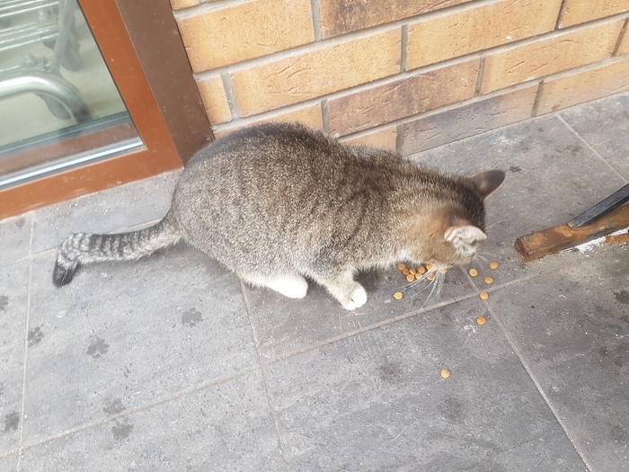 А вот животное исходного окраса. Отчётливо виден зонарный, или тиккированный, или агути-окрас - каждый волосок зонарно окрашен в несколько цветов. Такие окрасы названы агути из-за сходства с окрасом одноимённого южноамериканского зверька, аналогичная аллель и окрасы есть у собак, зайцеобразных (например, кроликов), грызунов и некоторых других животных. Это старое фото из 2015 года, снимал на старой даче. Обычно у беспородных кошек рисунок полосатый (тигровый или макрель) или пятнистый, очень редко встречаются кошки с тиккированным окрасом без полос (как у камышового кота, "шинельный"):