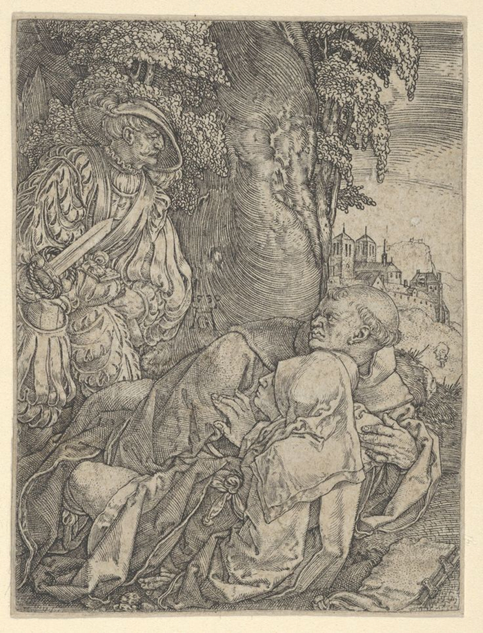 Или вот, например, на картине Никлауса Мануэля марширует наемник со своим сыном, обратите внимание на девушку у дерева.