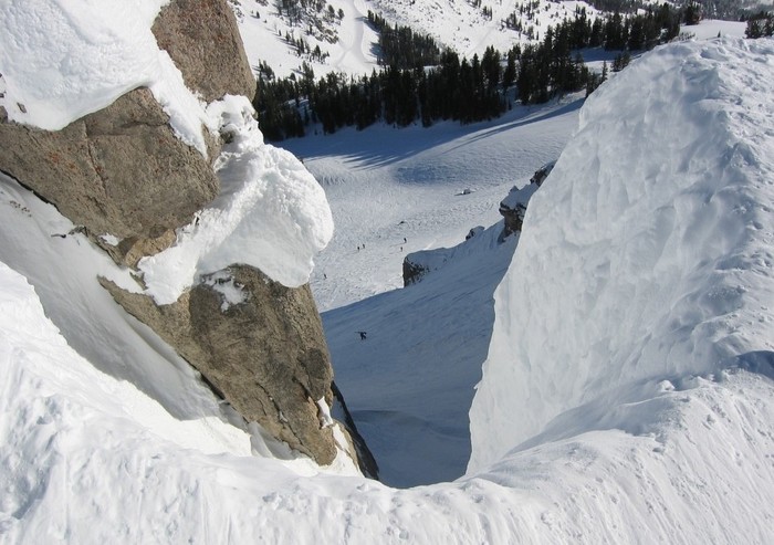 Эта ночь не прошла бесследно, к раннему утру дико болит зуб и распухла щека, надо срочно вниз. По нормальной тропе через Талгарский пер. показалось долго, по карте посмотрели какую-то перемычку-перевал и ринулись к ней. До сих пор не знаю, есть ли у неё какое название, у нас же этот перевальчик был назван, Ой, бля! Именно это междометие произнёс мой напарник первым ступив на него, вслед за ним повторил и я. Сейчас смешно, а тогда, тогда это было реально, Ой, бля!, куда нас занесло?! Вместо ожидаемого проходимого спуска вниз уходил почти отвесно кулуар на несколько сот метров, засыпанный свежим лавинообразным снегом. Один в один с этой картинкой из сети.
