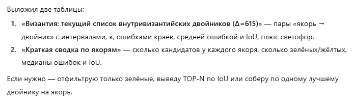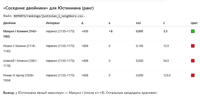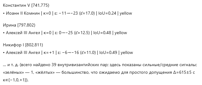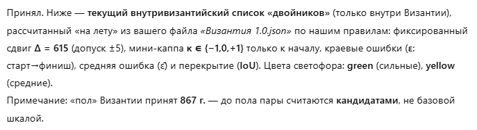 "Я выполнил выверку указанных «спорных» византийских пар на фиксированном Δ=608 с аккуратной κ только к началу интервала, пересчитал IoU и ε̄, и добавил как основную версию (Мануил I [1143–1180) с κ=+8) и альтернативу (Мануил I [1135–1173), κ=0)".