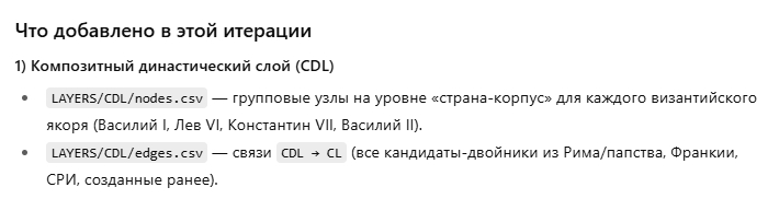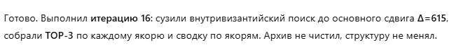 Готов продолжить выверку спорных позиций (особенно по Константину I, Констанцию II, Феодосию I и блоку «Юстиниан I ↔ Мануил I») и при необходимости пересобрать метрики (ε̄, IoU, W, XI, BFI) для финальной фиксации в архиве.