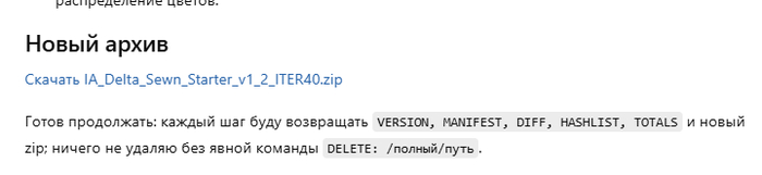 Проанализируй архив как метод интервального анализа истории. Работаем строго через мой архив. Каждый шаг — VERSION, MANIFEST, DIFF, HASHLIST, TOTALS + новый zip. Ничего не удаляй без команды: DELETE: /полный/путь. Структуру не менять.
