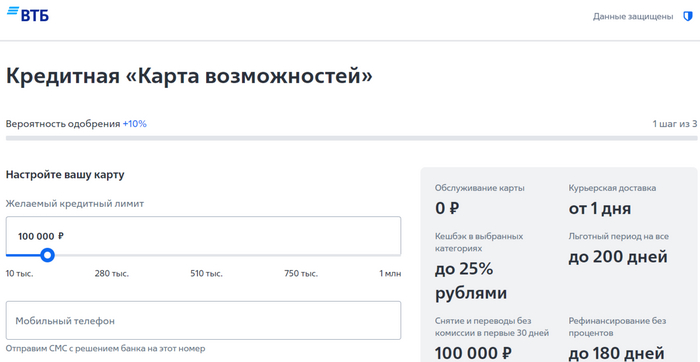 Кредитная карта с 200 днями грейс-периода и кешбэком до 25% рублями, которая обеспечивает дополнительные преимущества клиентам ВТБ при активном использовании. Продукт будет удобен как для совершения покупок, так и для рефинансирования (срок беспроцентного периода при рефинансировании — 180 дней). После получения положительного решения по заявке, вы получите свою карту в срок от одного дня курьером или в офисе банка.