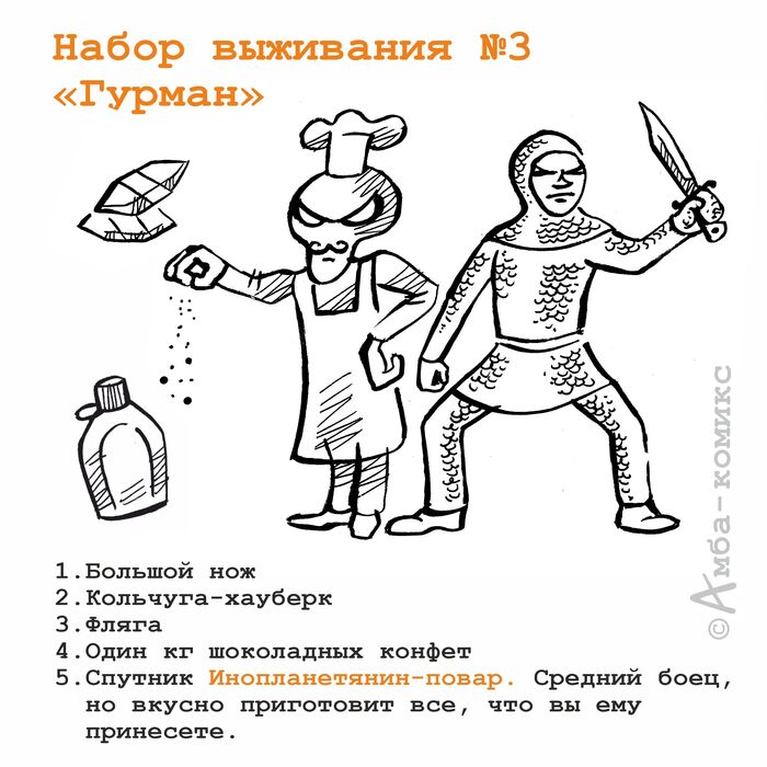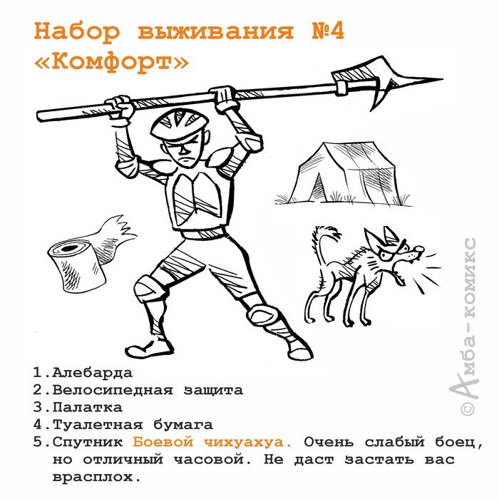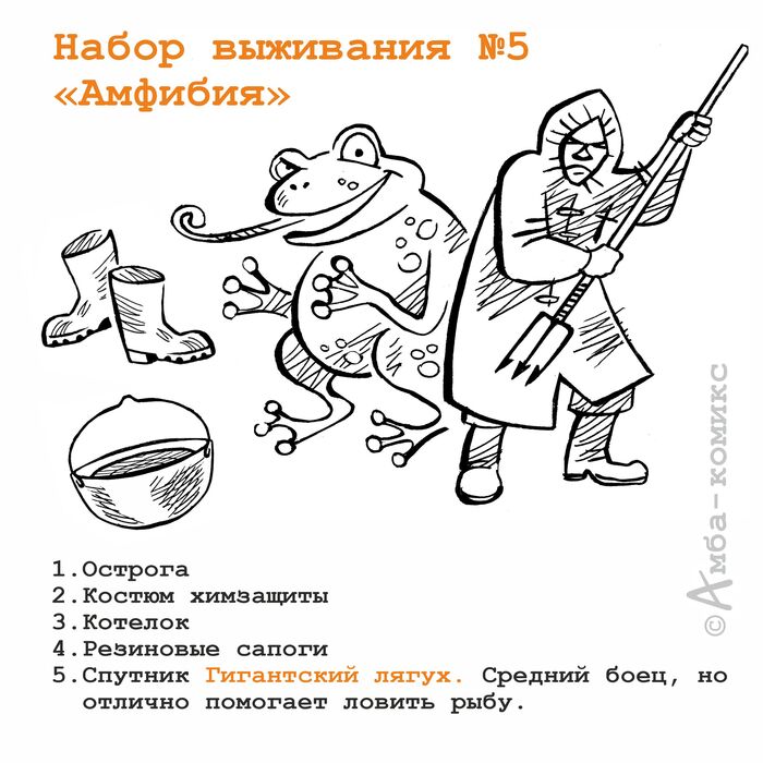 Вводная: Глобальный зомби-апокалипсис, вы сбегаете из города в лес. Вам нужно продержаться 5 суток на лесной поляне, около реки, пока не придет помощь. Вам дается на выбор один из шести наборов выживания. Больше никакого специального снаряжения у вас нет. Какой комплект выберете?