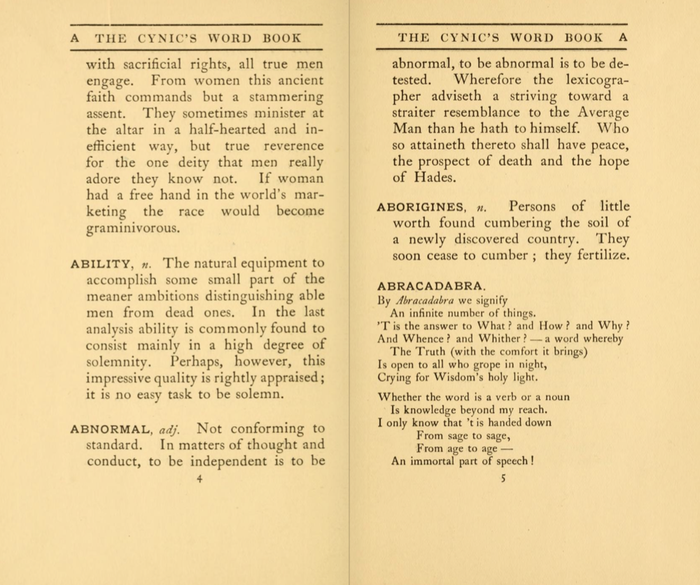 В оригинале словарь, естественно, на английском (журналист-то американский), и этот самый оригинал можно полнстью и безвозмезндо полистать на The Public Domain Review: https://publicdomainreview.org/collections/the-cynics-word-book-1906/.