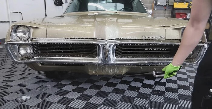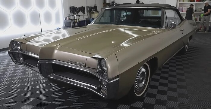 Pontiac Bonneville 1967 года — как раз из этого разряда. Грязный, покрытый толстой пылью экземпляр выглядел печально. Но только потому, что его не мыли 40 лет. Племянник владельца отогнал машину в детейлинг-центр, где ее отмыли, обработали различной автохимией — и автомобиль засиял.