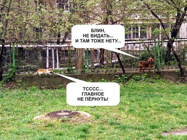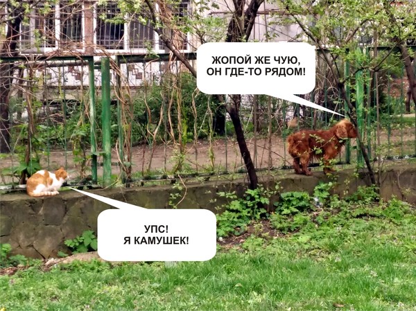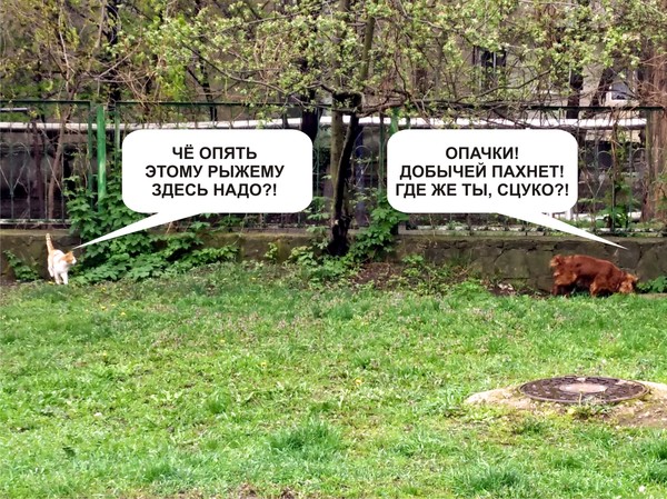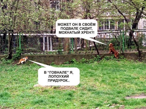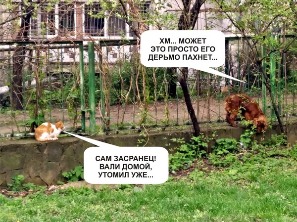 Данная соседско-дворовая кошка любит Шона дразнить- ей, видимо, тоже нравятся догонялки- провоцирует Шона, потом убегает на дерево и "показывает ему язык" оттуда. :-)
