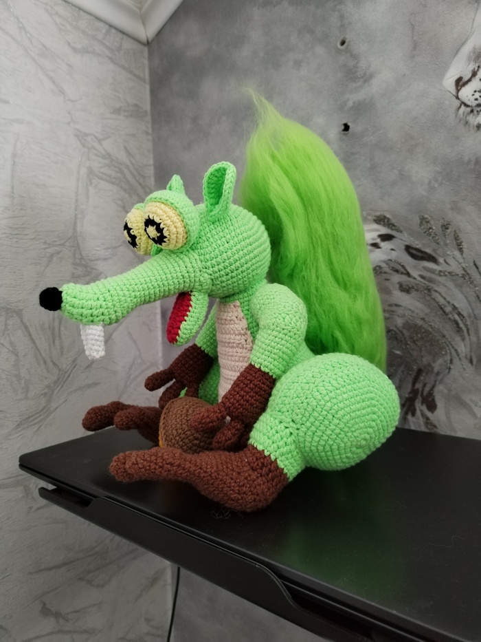Теперь подробнее. Недавно меня попросили связать белочку из мультика "Ледниковый период" Помните такую? Ну с желудем.. Думаю все помнят.. Так воот, вязала без мастер-класса, по картинке. Получилась игрушка высотой 17 см. Как вам? Похожая получилась? Связана из полушерсти. Зубки из полимерной глины. Заказчик остался доволен. Есть еще одна, связала повтор.. Если кому понравилась, пишите