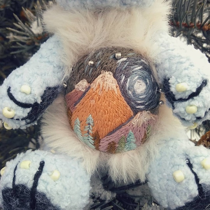 Игрушка связанна из плюшевой пряжи, крючком номер1,5 мм. Набита синтепухом. На пузике вышивка гладью нитками "Мулине". Носик из шерсти для валяния, глазки стеклянные. Готовая работа украшена бисером и пайетками.