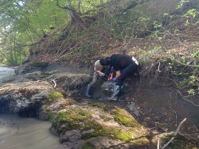 Ночью было очень холодно, одеваться было лень, так и промерз до самого подъема. Перед просыпанием сквозь сон услышал пение кукушки. Решил спросить у нее сколько найду аммонитов. В ответ на мой запрос - тишина. Спасибо конечно, за щедрость. Но чуть позже она снова подала голос, и я опять спросил, в ответ услышал 6. Нормально, правда впоследствии нашел больше. После завтрака начали обследование берегов, пошли первые находки, белемниты, отпечатки аммонитов, но целых пока нет. По мосту перешли на противоположный берег. Вышли на обнажения юрских глин с большими круглыми валунами, напоминающими НЛО. Разбивая эти камни, находили кусочки небольших аммонитов.