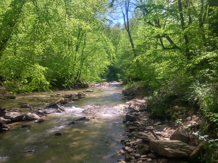 Следующий день гуляли уже не вдоль берегов Белой, а по ее притоку - Полковницкой балке. Места очень красивые, можно хоть целый день бродить и ничего не найти, но остаться довольным: постоянная тень, тихое журчание воды, отпечатки больших аммонитов, которые кто-то уже успел выбить и унести туда, где их больше никто не увидит. Вместе с нами по речке гуляли два мужика, палеонтолога любителя. Немного поговорив с ними, узнал от них, что местный музей в поселке Каменномостском обязательно надо посетить. По их словам коллекционер дядя Володя расскажет много чего интересного. Так оно впоследствии и оказалось, но об этом позже. Парни особыми находками не порадовали как и мы их. Но сейчас, вспоминая этот ручей, хочется вернуться и забраться дальше, насколько это возможно, так как один мужчина, которого на этой речке встретил Пещенко, объяснил в какую сторону нужно двигаться, чтобы выйти на интересные места.