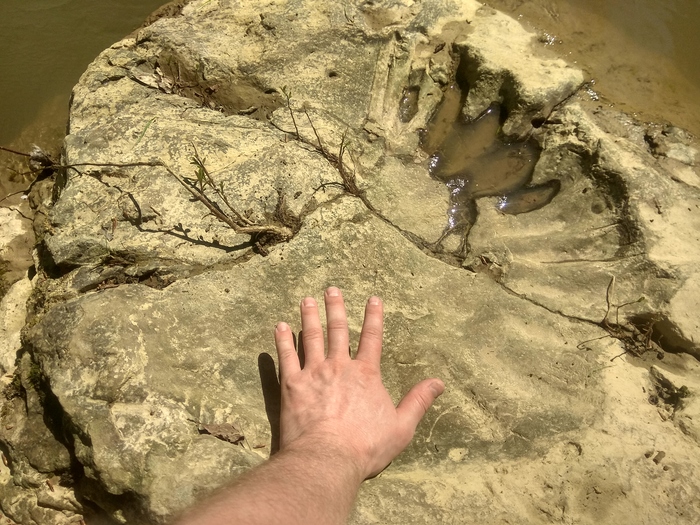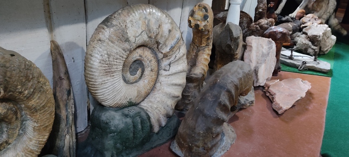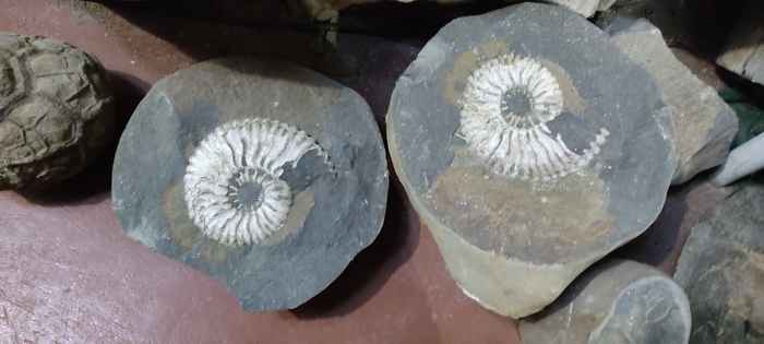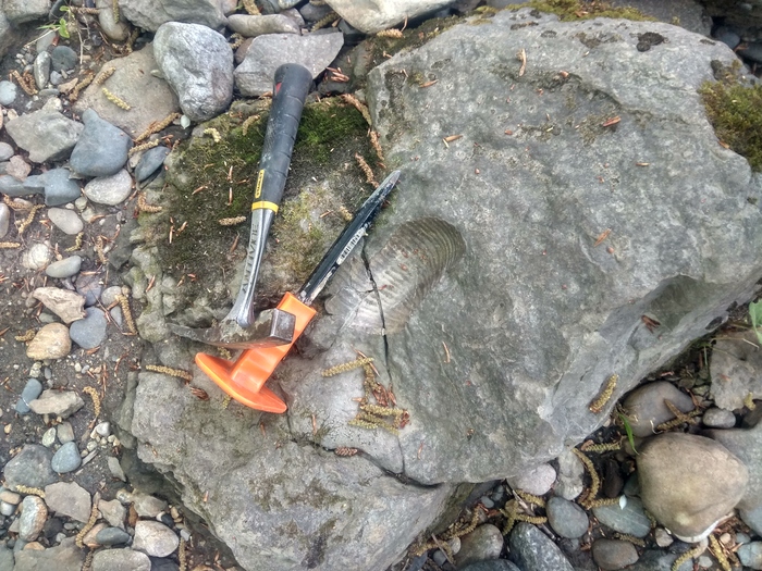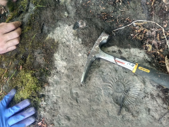 Подходя к одному из этих валунов, одновременно с Рындиным громко крикнули и ткнули пальцем на небольшой розовый, судя по справочникам Euphylloceras, расположившийся прямо внутри конкреции. Аккуратно работая молотком и зубилом выбили его - первая хорошая находка, помещающаяся в спичечный коробок. Шарообразных конкреций вокруг целая куча и непонятно какая из них подарит тебе стоящую окаменелость. Прыгая по валунам, я добрался до туннеля, который состоял из полукруглой стенки утеса, сверху которого нависали корни деревьев. Получалась естественная природная композиция, которую про себя я назвал натуральным палео музеем, так как входя внутрь и рассматривая его стенки, можно было обнаружить большое множество различных перламутровых отпечатков, а также освежиться после стоящей жары за счет падающих на тебя капель.