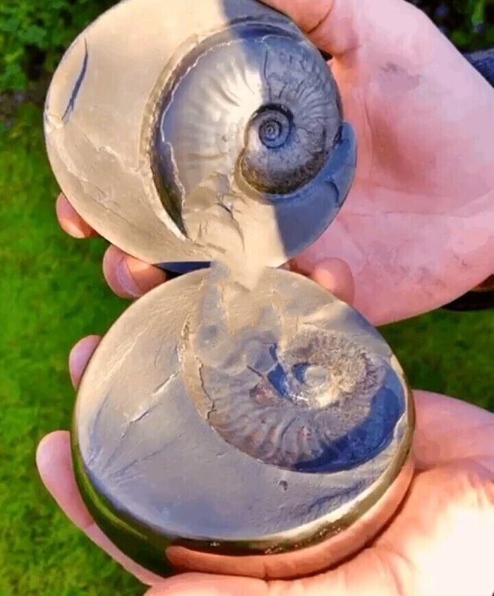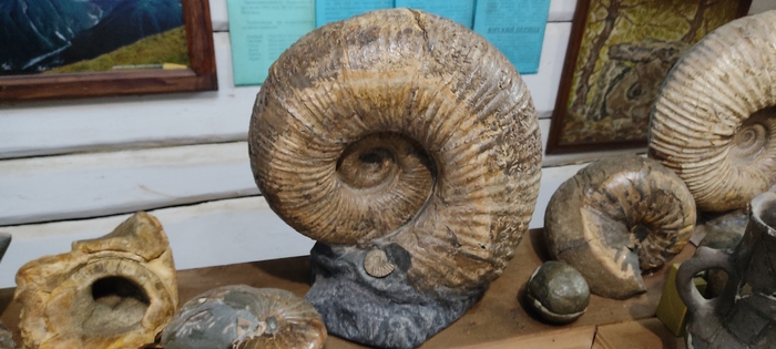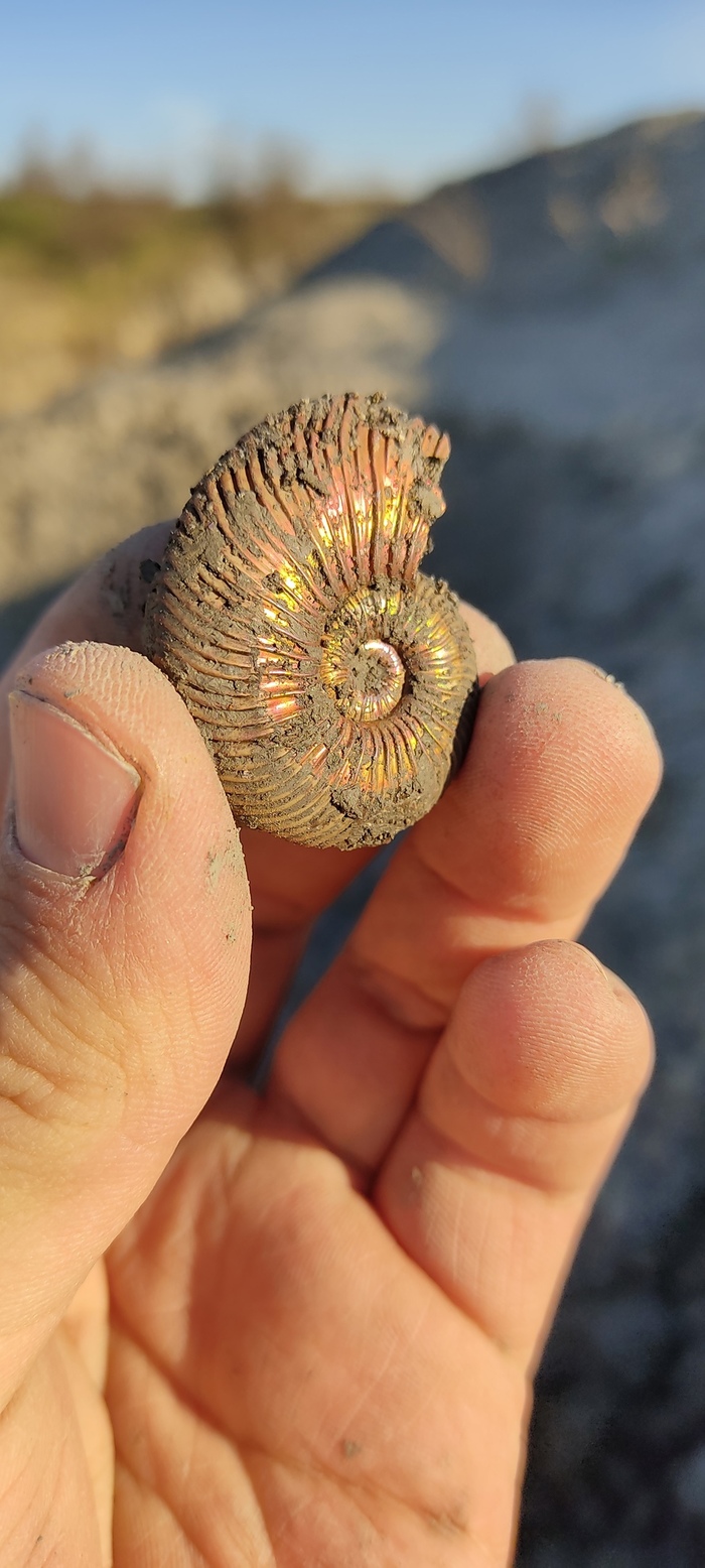 Но захотелось пройти дальше и посмотреть, что есть еще там впереди, ведь стена серой глины не заканчивалась. С трудом продвигаясь по краю обрыва вышел на место, по которому дальше пройти невозможно - крутая стена, внизу река. Но! Впереди метрах в 7-8 увидел небольшой выступ стены, а на нем как на подставке в музее лежит крупный диаметром сантиметров 30 аммонит. У меня перехватило дыхание и задрожали руки.