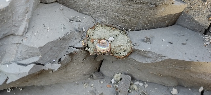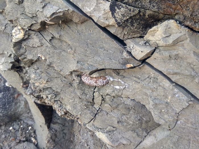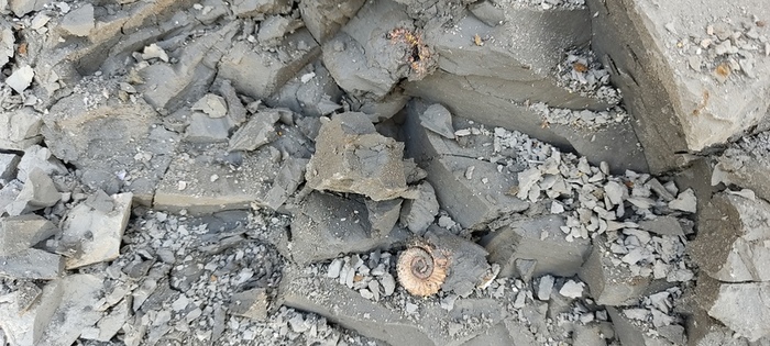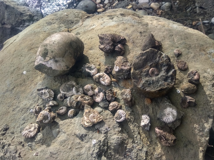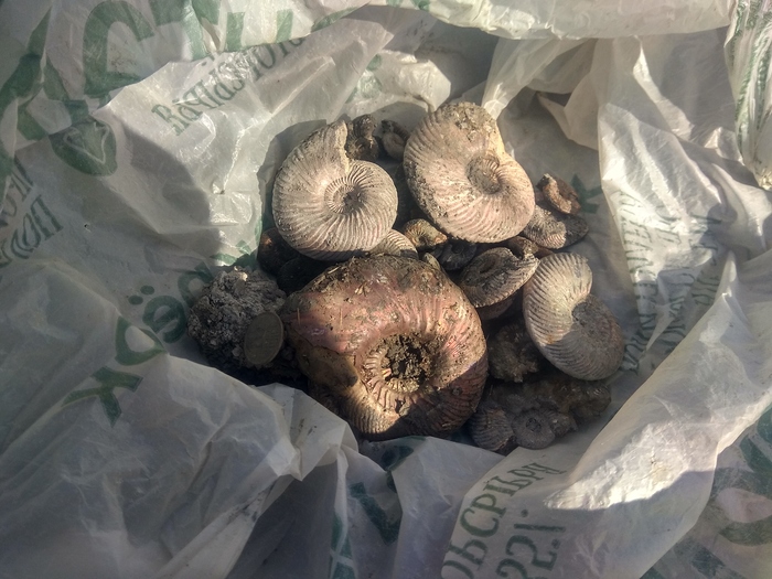 В назначенное время все собрались и пошли. Тут, как говорится, кто во что горазд. Кому-то нравится тщательный осмотр берегов, неспешный обзор камней и медленное передвижение. Я же люблю идти вперед до тех пор пока не найду что-то вроде золотоносной жилы, иногда кто-то следует моему примеру, а иногда остаюсь один. Такое бывало в детстве, когда ездил за ягодами с родственниками. Не любил колупаться, если ягод мало - азарта нет. Начинал бродить искать места получше. В таких случаях варианта два. Либо найдешь место с крупной ягодой и за короткое время наберешь ведро, вернешься довольный, указав всем место. Либо останешься ни с чем, так как время пройдет, пора уезжать, а ты с пустым ведром. Но в любом случае в обоих вариантах скучать ты не будешь. В этот раз вместе со мной пошел Нуржанов. Мы вышли на стену юрской глины, в которой нашли конкреции, слепленные из множества небольших аммонитов. Стали их извлекать. За короткое время удалось добыть штук 20-25.