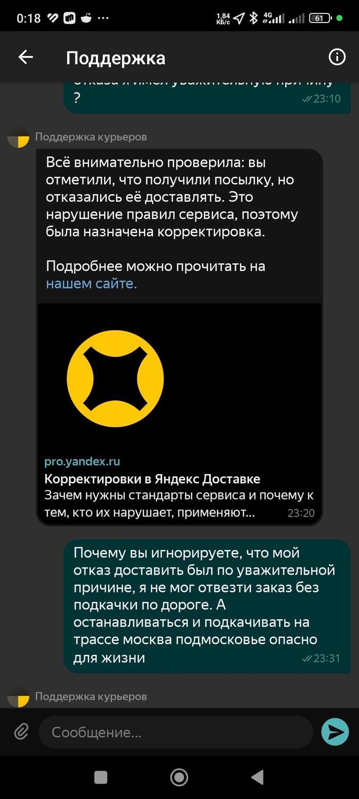 В итоге за 2 дня, я никак не мог оспорить штраф, вынуждающий выполнять взятый курьерский заказ яндекса.