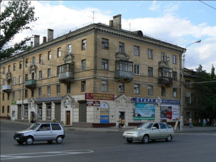 Тяжеловесные бетонные кадки с цветами, дома пятиэтажек имеют декоративную облицовку, двери деревянные, вокруг двери выложено камнем, монструозные статуи пролетариям или арки со статуями богатырей: