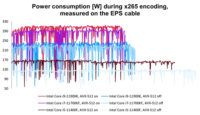 Почему? Причин на это несколько. Во-первых, при использовании новых инструкций и так не холодные процессоры Alder Lake потребляют намного больше энергии и еще сильнее разогреваются — температуры под нагрузкой увеличиваются на десяток-полтора градусов. При таком использовании приемлемые результаты охлаждения начинают показывать только дорогие кулеры и водяные СО. То же самое было и в предыдущем поколении Rocket Lake при задействовании AVX-512.