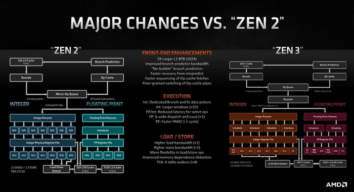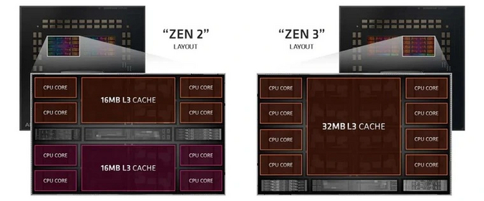 Изменения в Zen 3 направлены в первую очередь на устранение слабых мест, выявленных в Zen 2. Процессорные чиплеты CCD остались восьмиядерными, но внутренняя компоновка из двух четырехъядерных CCX была упразднена. Теперь в каждом CCD один восьмиядерный CCX и общий на восемь ядер кеш L3 объемом 32 МБ — это снижает задержки общения между ядрами и положительно влияет на производительность. Ядра Zen 3 получили увеличенные буферы для работы с инструкциями, улучшенный FPU и предсказатель переходов, а также восемь исполнительных портов. Совокупность изменений подняла производительность до 20 % на одной частоте по сравнению с Zen 2.