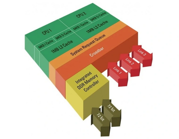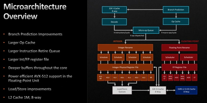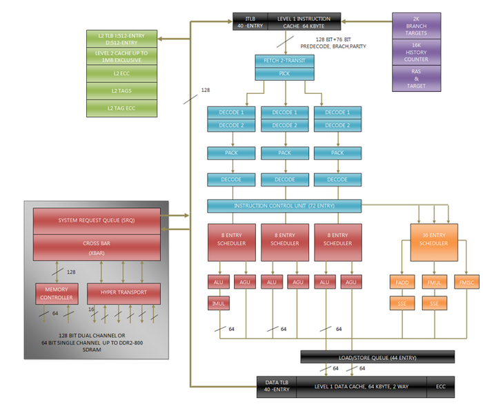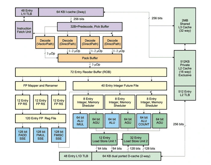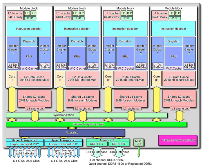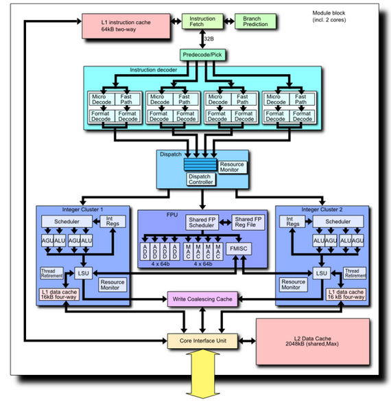 Каждый из двух блоков целочисленных операций имеет четыре конвейера, но стадии выборки и декодирования для пары являются общими, за счет чего четыре операции за такт возможны лишь суммарно для обоих блоков. Кеш L1 для данных объемом в 16 КБ для каждого из блоков свой, а вот L1 для инструкций объемом 64 КБ общий для двух блоков. Кеш L2 объемом 2 МБ также общий для них, а кеш L3 — общий для всех ядер ЦП, его объем до 8 МБ. Встроенный контроллер памяти DDR3 поддерживает до 32 ГБ ОЗУ с предельной частотой 1866 МГц.