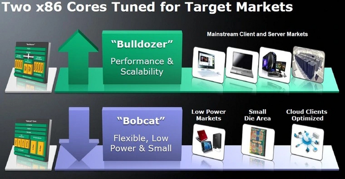 Помимо «взрослых» моделей, в 2011 году были представлены и APU с низким энергопотреблением для рынка планшетов, нетбуков и бюджетных ноутбуков. Специально для них AMD разработала упрощенную процессорную архитектуру Bobcat, ранее разрабатываемую под кодовым именем K14. Процессоры на новой архитектуре должны были конкурировать с Atom от Intel. Процессоры Bobcat являются первыми системами на чипе компании — помимо интегрированных компонентов северного моста, в их состав входит и функциональность южного моста. Производились SoC по техпроцессу 40 нм.