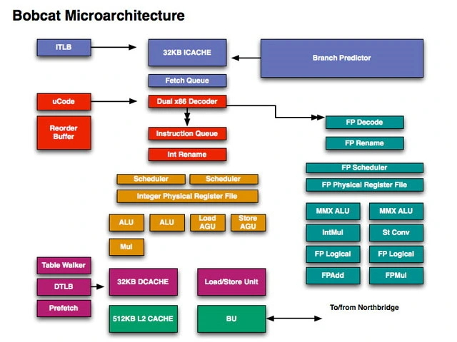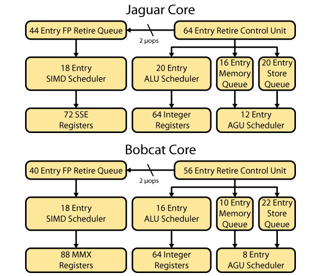 Ядро Bobcat является суперскалярным и поддерживает внеочередное исполнение, но умеет выполнять лишь две инструкции за такт. При этом производительность на одной частоте на 10-20 % ниже, чем у K8, который умел выполнять до трех инструкций. Конвейер состоит из 15 стадий. По сравнению с K10 ядра медленные, но очень компактные — на месте, занимаемом на кристалле одним ядром K10 с кешем L2, можно разместить два ядра Bobcat с кешем по 512 КБ на каждое. Кеш L1 для данных и инструкций имеет одинаковый размер — по 32 КБ на каждый.