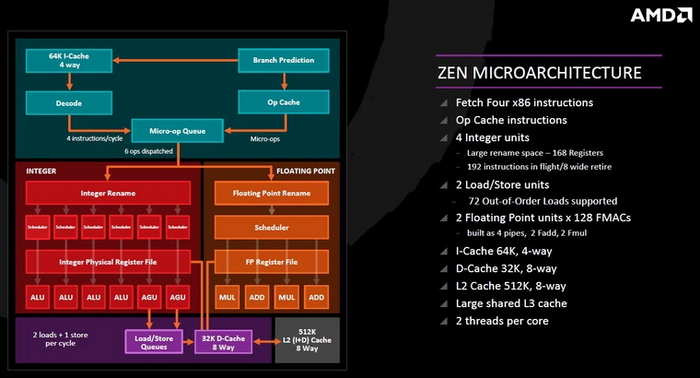 Архитектура Zen не основывается на предшественнике Bulldozer, являясь самостоятельной разработкой. Отказавшись от модульной системы, ядра AMD впервые стали поддерживать технологию одновременной многопоточности SMT, позволяющую одновременно обрабатывать два потока — аналогично Hyper-Threading от Intel. Ядро Zen содержит шесть исполнительных портов и может выполнять до четырех инструкций за такт. Вдобавок к этому, оно получило усовершенствованный предсказатель переходов, увеличенные буферы для работы с инструкциями и кеш микроопераций. В итоге производительность на одной частоте по сравнению с последним поколением Bulldozer, ядром Excavator+, выросла более чем на 50 %. Несмотря на полученные улучшения, FPU остался 128-битным, из-за чего приходится тратить два такта на исполнение 256-битных инструкций AVX2.