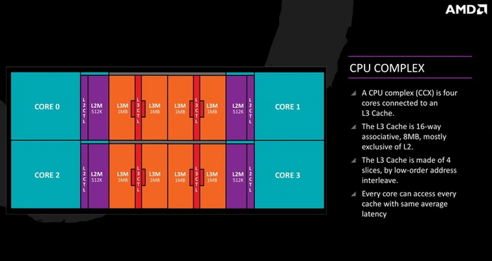 Процессор может состоять из нескольких CCX, обмен данными между которыми происходит по новой скоростной шине Infinity Fabric. Пара CCX компонуется в один кристалл CCD, помимо процессорных ядер содержащий в себе двухканальный контроллер памяти DDR4, контроллер шины PCI-E 3.0, накопителей и портов USB — новые процессоры являются системами на чипе, и внешний чипсет им нужен лишь для расширения периферийных возможностей. Одним из главных преимуществ архитектуры является изначально заложенная масштабируемость — несколько чиплетов CCD могут быть объединены под крышкой одного процессора для создания высокопроизводительных моделей. Производятся кристаллы по техпроцессу 14 нм.