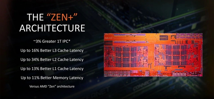 В апреле того же года AMD выпускает процессоры без встроенной графики семейства Ryzen 2000 на архитектуре Zen+. Новые модели Pinnacle Ridge перенесли на 12 нм техпроцесс. Были уменьшены задержки кеша и контроллера ОЗУ, оптимизирована компоновка для достижения более высоких частот. Пиковые частоты достигли 4.3 ГГц при сохранении прежнего TDP, а для памяти стал доступен режим DDR4-2933. Работа технологии PBO была улучшена — она стала активнее задействовать повышение частот. В начале 2019 года на базе Zen+ были выпущены обновленные APU под кодовым именем Picasso, их ассортимент аналогичен прошлому поколению.