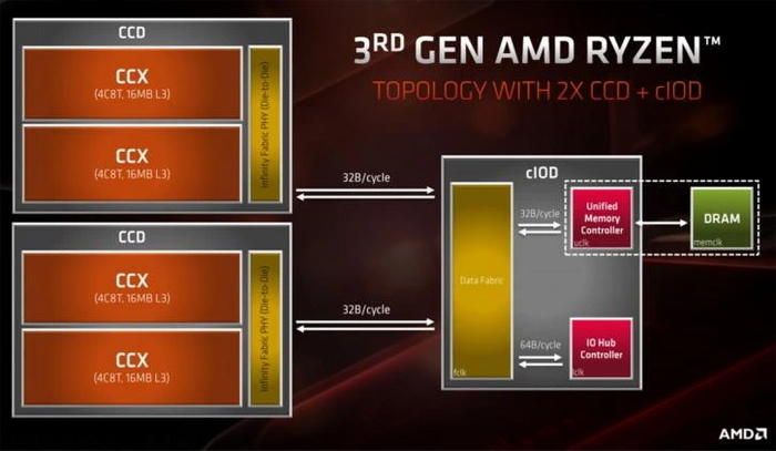 В массовых моделях для сокета AM4 впервые была применена мультичиповая компоновка. Процессоры серии состоят из чиплетов — одного или двух кристаллов CCD с процессорными ядрами, производимых по технологии 7 нм, а также общего кристалла ввода-вывода, который производится по более «толстым» нормам 12 нм. Как и прежде, в состав каждого ССD входит два комплекса CCX по четыре ядра, что впервые позволило реализовать до 16 ядер на массовой платформе.