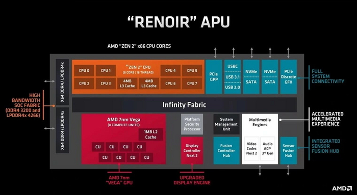 В 2020 году на базе Zen 2 были выпущены новые APU Ryzen 4000 серии под кодовым названием Renoir. Они получили однокристальную компоновку и производятся по техпроцессу 7 нм. Встроенная графика ускорилась, а ассортимент по сравнению с прошлым поколением APU претерпел изменения: впервые в этом сегменте были представлены восьмиядерные Ryzen 7. Ryzen 5 получил шесть ядер, Ryzen 3 остался четырехъядерным. Все модели получили поддержку технологии SMT. При этом кеш L3 был уменьшен в четыре раза по сравнению с десктопными Ryzen 3000 — до 8 МБ у старших моделей и 4 МБ у младших. К тому же, в отличие от Matisse, новые чипы оказались обделены поддержкой PCI-E 4.0: для них доступна лишь третья версия интерфейса.