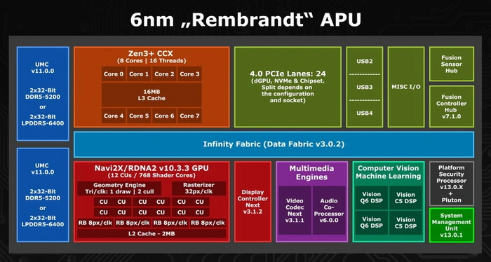 В январе 2022 года были выпущены обновленные мобильные APU Ryzen 6000 под кодовым названием Rembrandt, относящиеся к поколению Zen 3+. Кристаллы были перенесены на техпроцесс 6 нм и получили более экономичную схему управления питанием, а встроенную графику Vega заменила современная на базе архитектуры RDNA2. Новый контроллер памяти поддерживает ОЗУ DDR5-5200 и LPDDR5-6400. Впервые для APU был интегрирован контроллер PCI-E 4.0. Пиковые частоты подросли до 5 ГГц, а тепловыделение по сравнению с предшественниками сократилось. В январе 2023 года обновленные модели на базе того же кристалла попадают в состав серии APU Ryzen 7000.