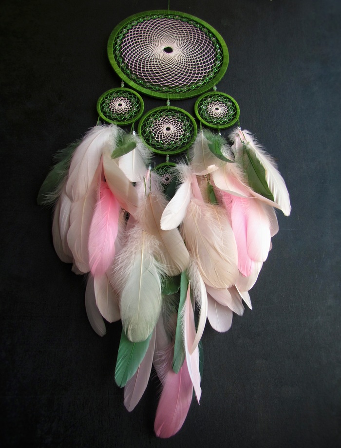 Ловец снов в природных, лесных цветах был выполнен на заказ. В работе использованы деревянные и стеклянные бусины, крошка натурального малахита, перья гуся и фазана.