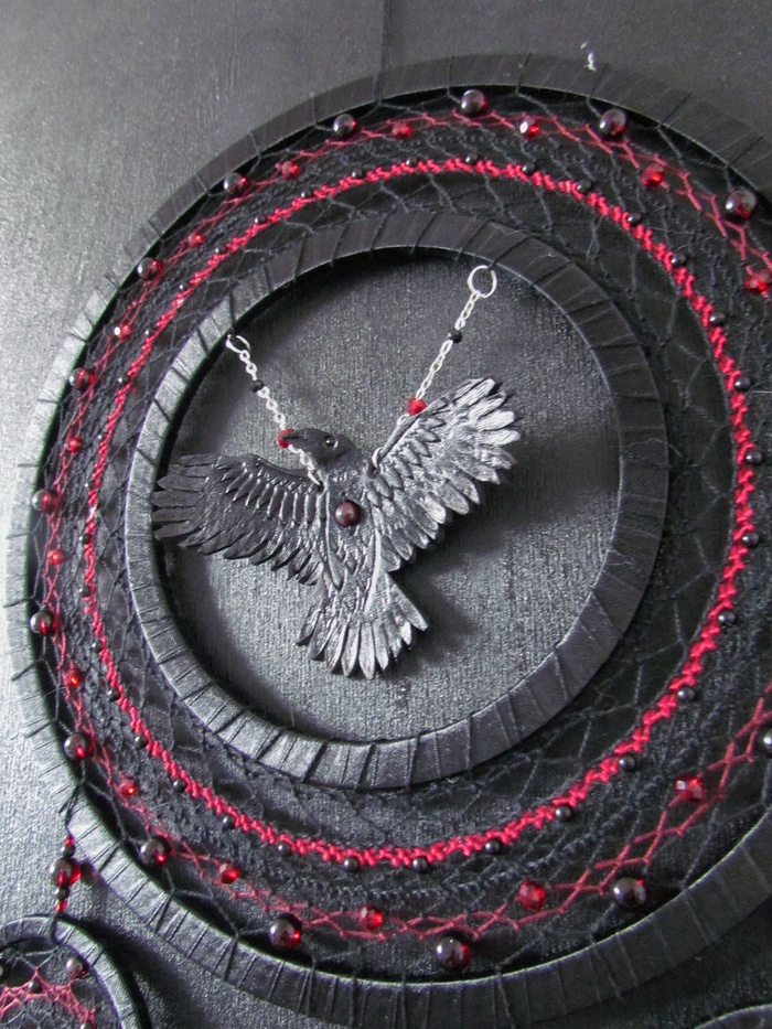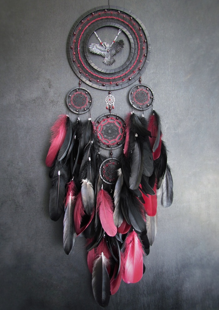 Поистине необычный ловец снов в длину более метра. Центральная фигура - вóрон ручной работы из натуральной кожи, его я заказывала отдельно у мастера. В такой ловец мне хотелось добавить все самое лучшее, поэтому вместо стекла были использованы бусины из натурального граната и халцедона. Ну и, конечно, обязательным атрибутом являются натуральные перья из крыльев вóрона. Нечасто удаётся найти в продаже такие крупные и аккуратные перья линьки, действительно повезло! Зато смотрите, какой готичный красавец получился)