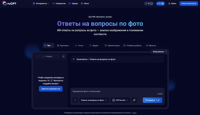 Именно эту задачу решают современные нейросети для ответов на вопросы по фото, которые способны «читать» изображение и формировать осмысленные ИИ-ответы. В качестве практического инструмента для такой работы можно использовать ruGPT.io — агрегатор нейросетей, где анализ изображений сочетается с пониманием контекста, извлечением текста и возможностью задать уточняющие вопросы к загруженному фото, получая быстрый и понятный результат в одном интерфейсе.
