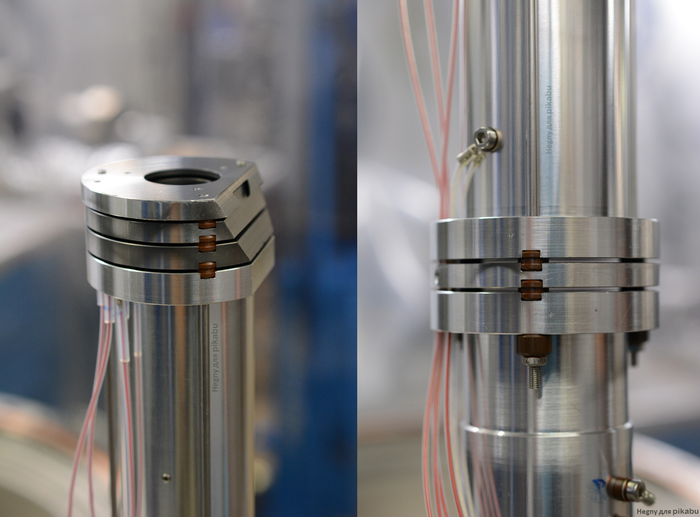 Хорошо видны изолирующие проставки между металлическими цилиндрами. Каждый цилиндр подключен проводом к блоку управления, который управляет потенциалом, изменяя параметры оптики.