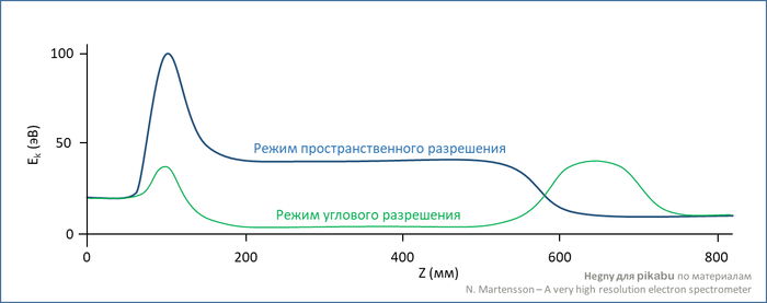 Ниже приведены графики кинетической энергии электронов вдоль их траектории внутри спектрометра для двух разных режимов работы оптики:
