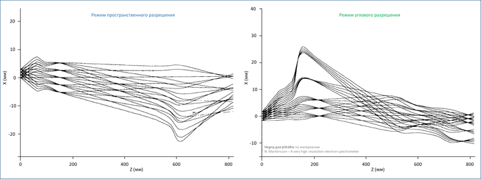 Мы видим, что на входе в первую линзу энергии электронов одинаковые. В самом конце пути они тоже одинаковые, однако координаты электрона вдоль всего пути и на экране будут разные для этих режимов:
