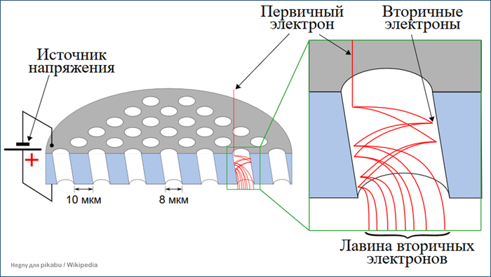 Дело в том, что один электрон вызывает очень слабое свечение люминофора, поэтому его надо как-то размножить. Вместо массива фотоэлектронных умножителей используется пластина с наклонными микроканалами, покрытыми материалом с высоким коэффициентом выхода вторичных электронов: