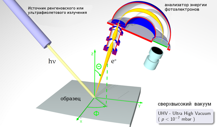 Есть несколько методов исследования вещества, при которых из подопытного образца вылетают электроны разной энергии. Например, если на любой материал посветить, как в нашем случае, ультрафиолетовым или рентгеновским лучом, то из материала полетят "выбитые" излучением электроны (кстати, за объяснение этого эффекта, называемого "фотоэффект", Эйнштейн получил Нобелевскую премию, а не за теорию относительности). И не только они, там есть еще куча вторичных процессов, в результате которых вылетают электроны других энергий и даже вторичное излучение. Но сегодня нас интересуют только электроны.