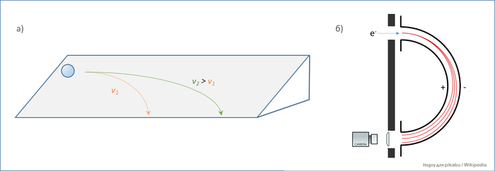 Если электрон (заряжен отрицательно) будет лететь между двумя заряженными пластинами, то он будет отклоняться в сторону положительно заряженной (этим занимается сила Лоренца). Причем, отклоняющая сила заряженных пластин не зависит от скорости электрона - она одинаково поворачивает и быстрые и медленные электроны. Это означает, что быстрые электроны полетят по бОльшей дуге, чем медленные. В качестве аналогии можно представить наклонную плоскость, по которой поперек склона катают шарики (рисунок а). Шарик с большей начальной скоростью прокатится дальше, чем медленный шарик. Измерив расстояния, на которое прокатился шарик, можно вычислить его начальную скорость. Только вместо шариков у нас электроны, а вместо гравитации - электрическое поле.