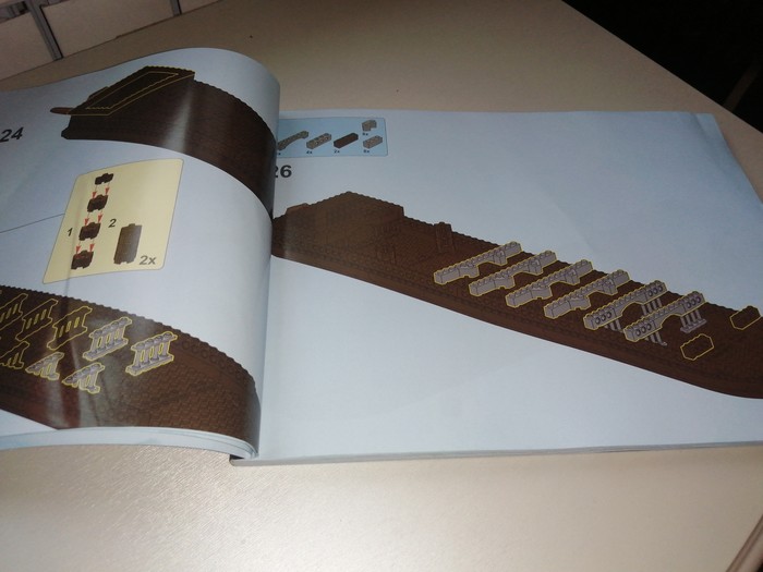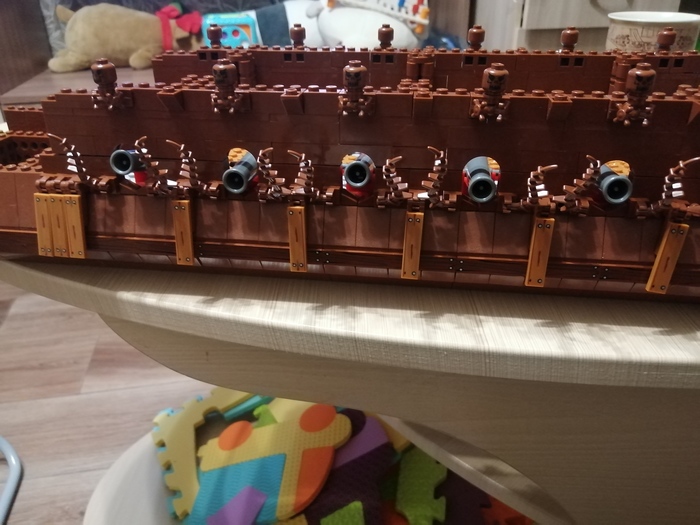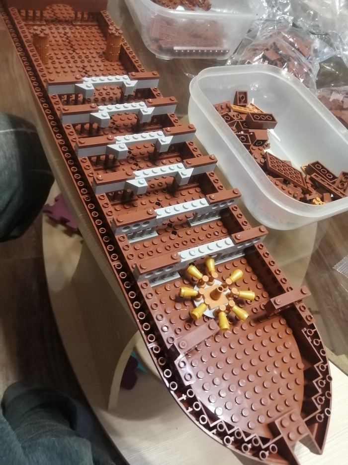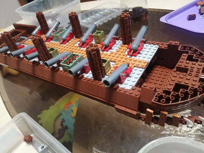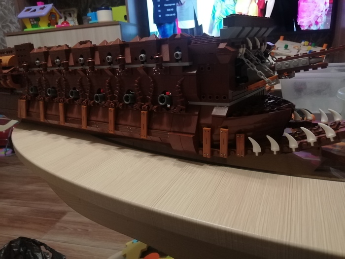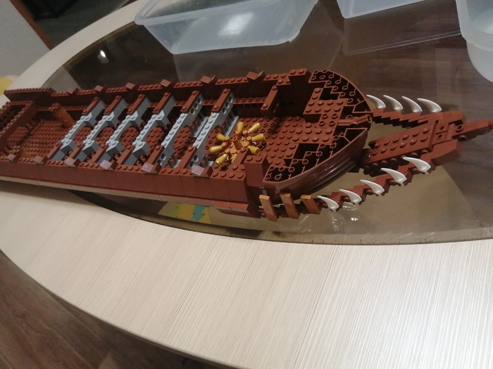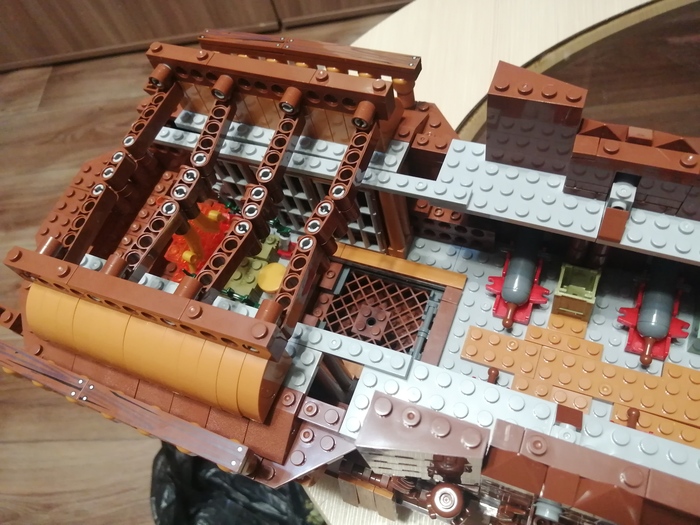 Модель сочетает в себе элементы традиционных кубиков и детали серии Техник. Корабль довольно таки длинный потому такое сочетание обеспечивает прочную конструкцию.