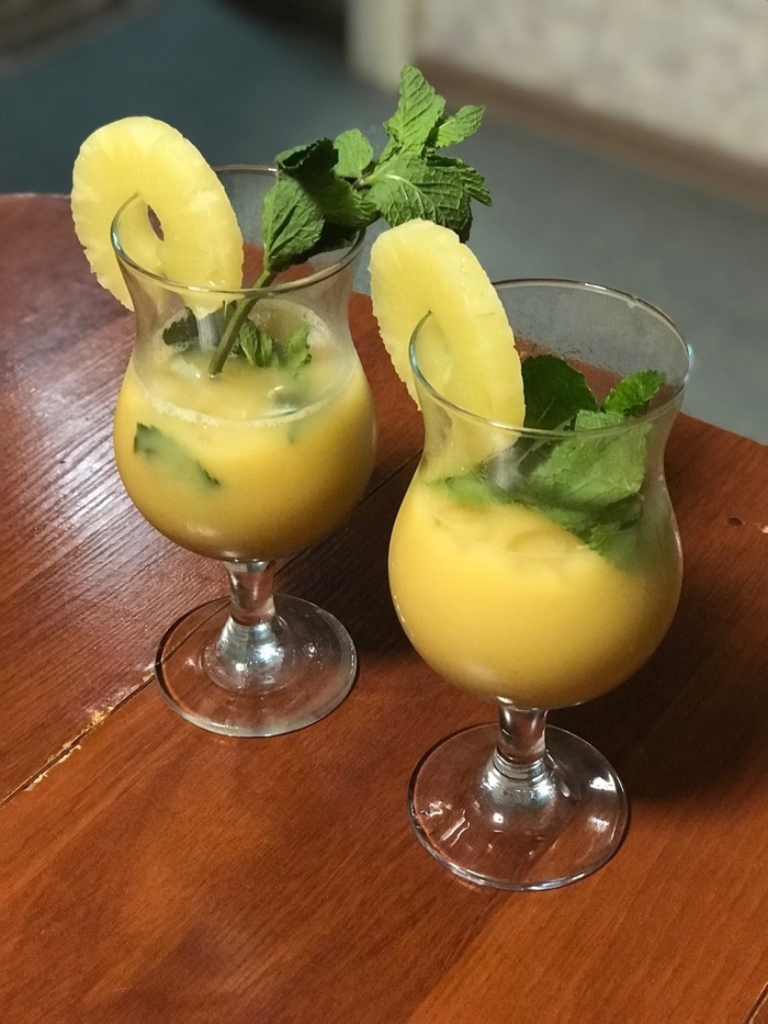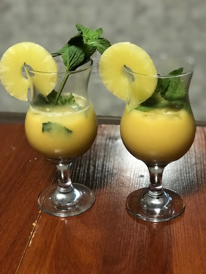 Украсьте веточкой мяты и долькой ананаса на краю бокала.