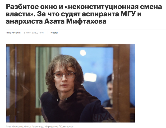 Повод для заключения молодого математика в тюрьму — разбитое в ночь на 30 января 2018 года окно в офисе «Единой России» и брошенная внутрь шашка. Никто не пострадал. Фигурантом этого дела 27-летний Азат Мифтахов стал в феврале 2019 года — по части 2 статьи 213 УК («хулиганство») молодым людям грозило до 7 лет колонии. Единственным доказательством вины математика стали показания «Андрея Ивановича Петрова» — засекреченного свидетеля, который якобы видел, как шестеро напали на офис «Единой России», и одним из них был Мифтахов. «Петров» узнал математика в маске, поскольку у того были «выразительные брови».